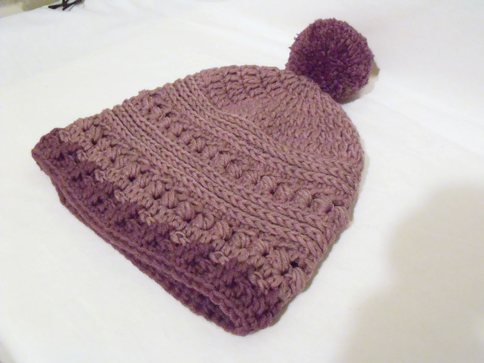 Here we have a pure wool lilac crocheted slouch pom pom hat