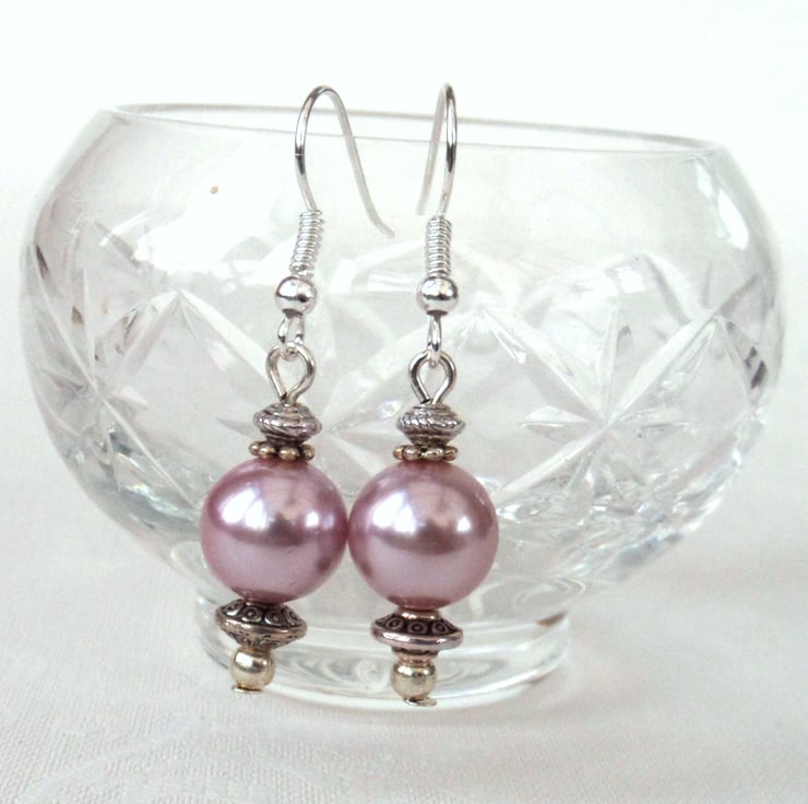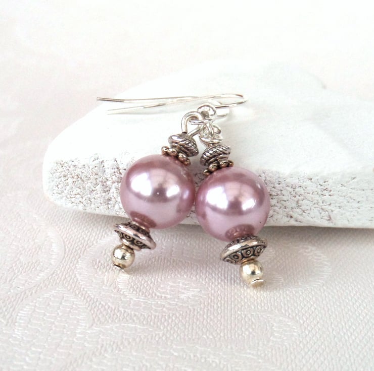 A lovely pair of dusky pink shell pearl earrings that would be perfect as bridal jewellery.