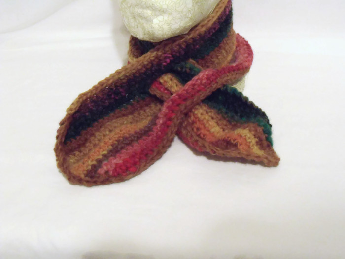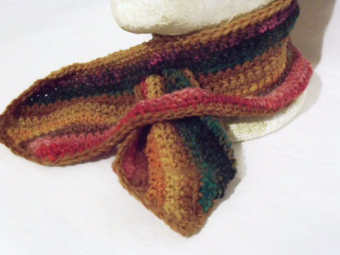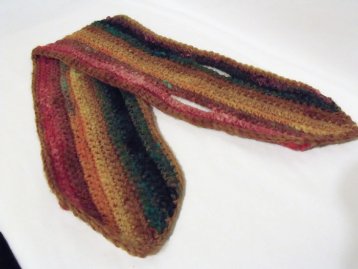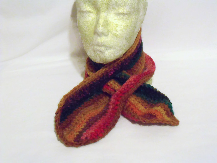 Here is a pure wool multi coloured crocheted scarfette which is a short scarf.