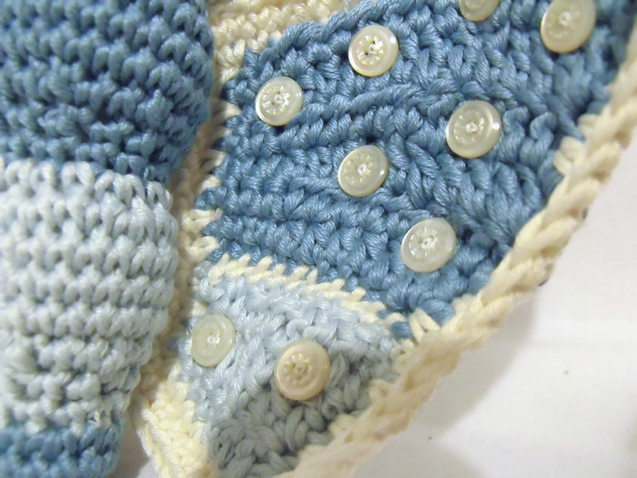 She is 100% cotton and is blue and cream.