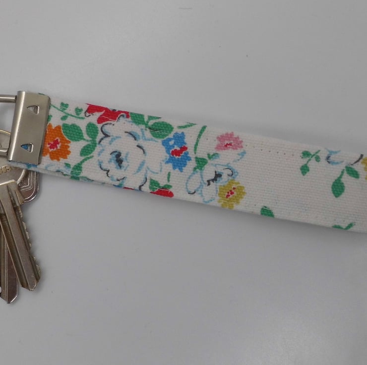 This key fob is made with a Cath Kidston floral fabric. It has a sliver tone fixing with a split ring at the end. The strap measures approx 5 inches when laying down flat and is about an inch wide.