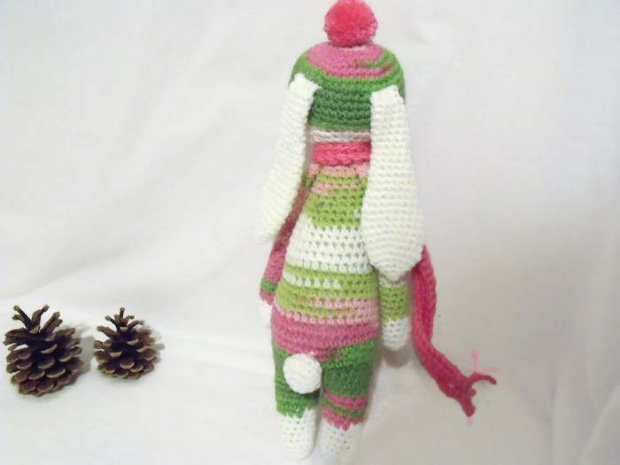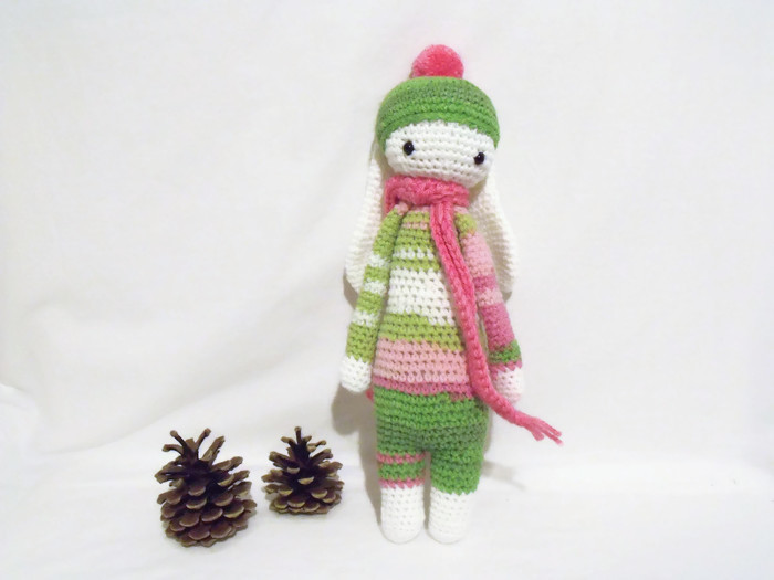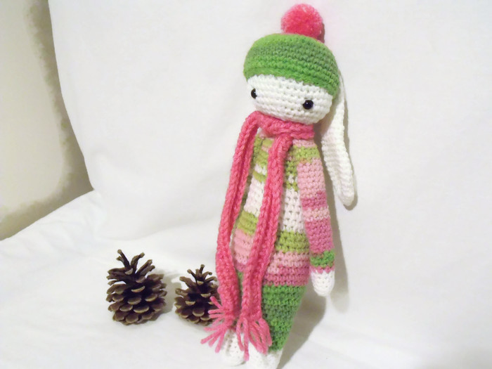 Here we have a crocheted Lalylala amigurumi rabbit doll in pink and green and wearing a matching pink scarf, and I've made a pink pom pom for her hat.