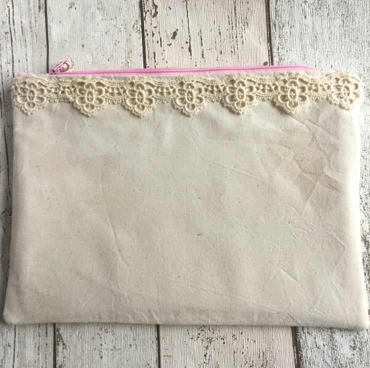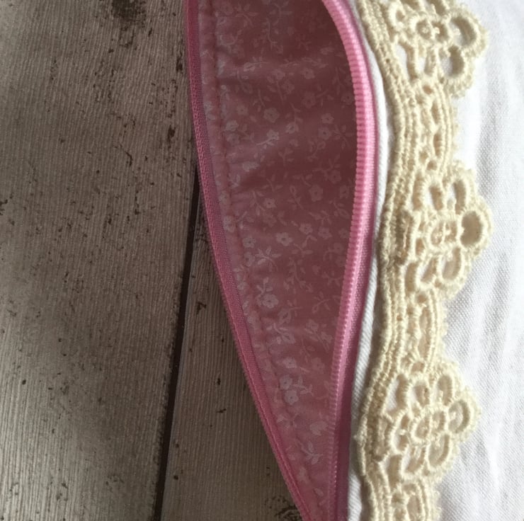 A pink nylon all purpose zip has been colour matched with the roses and a detachable zip pull with a silver metal scissor charm has been added. The pink cotton lining has a small flower print in white. A band of cream french lace runs along the top of both sides of the bag and completes the piece.