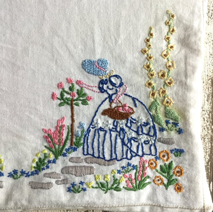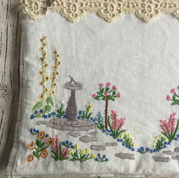 This upcycled zipped pouch is created from one half of a tea tray cloth I found in a charity shop. The worn white linen has a delightful picture of a crinoline lady shaded from the sun with a sunbonnet cutting roses in a beautiful summer garden with the path leading on to a sundial.
