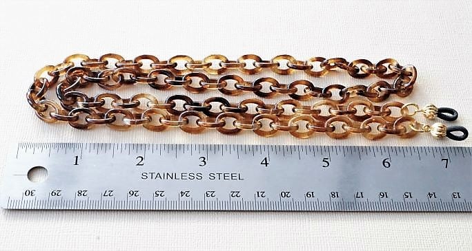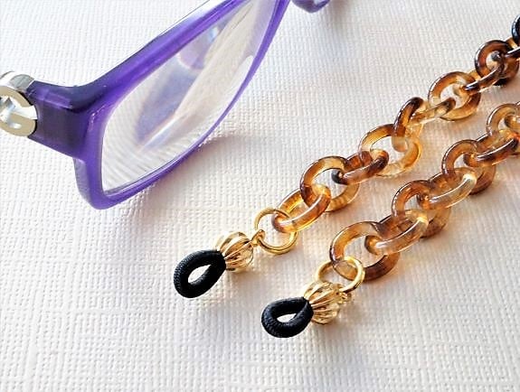 A lightweight modern glasses holder made with tortoiseshell acrylic chain and gold plated elements..