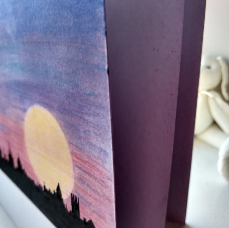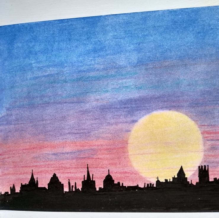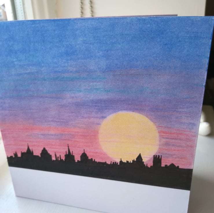 A completely handmade and uniquely designed card. Consisting of pristine white quality card which had the Oxford skyline hand drawn in black ink. The background sunset sky had been hand draw using pastels