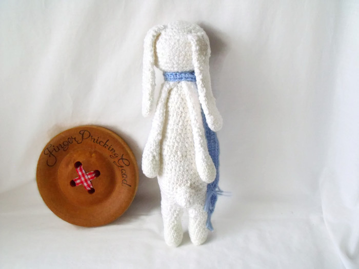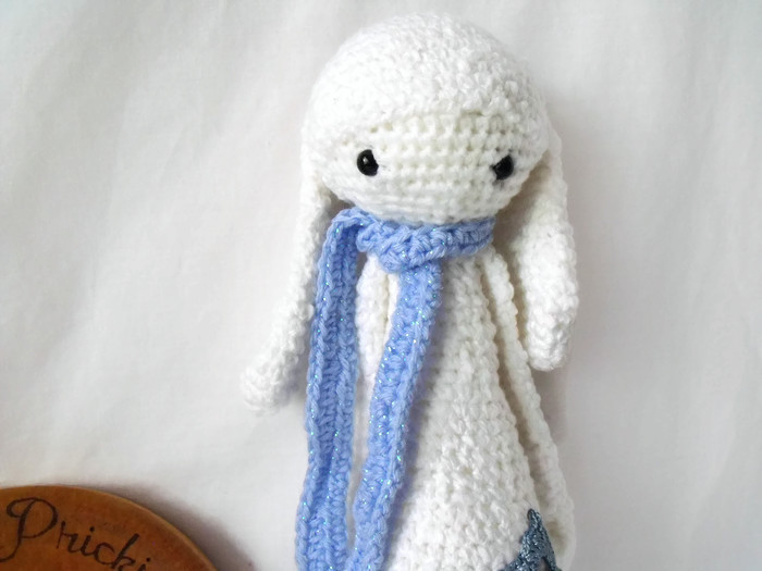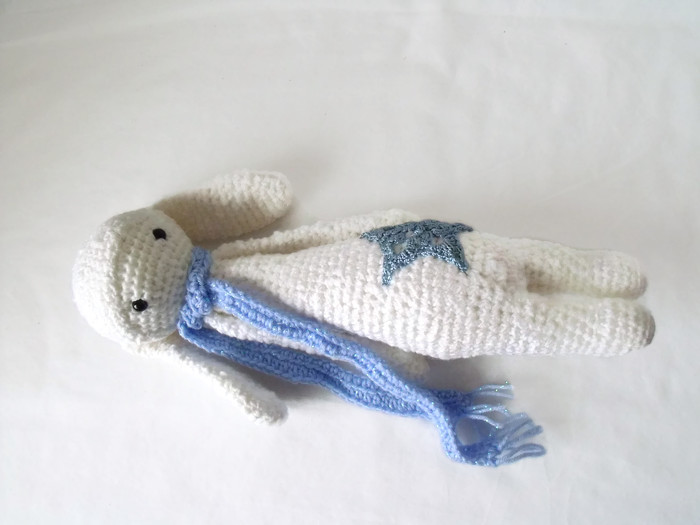 Here we have a white cotton crocheted Lalylala amigurumi snowflake rabbit doll.