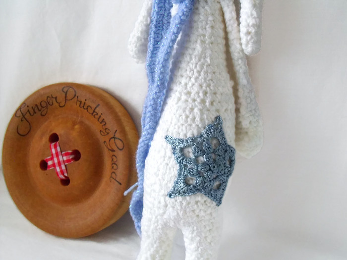 I've crocheted her using cotton boucle yarn. I then crocheted a delicate blue snowflake and attached it to her body. She wears a blue sparkly scarf.