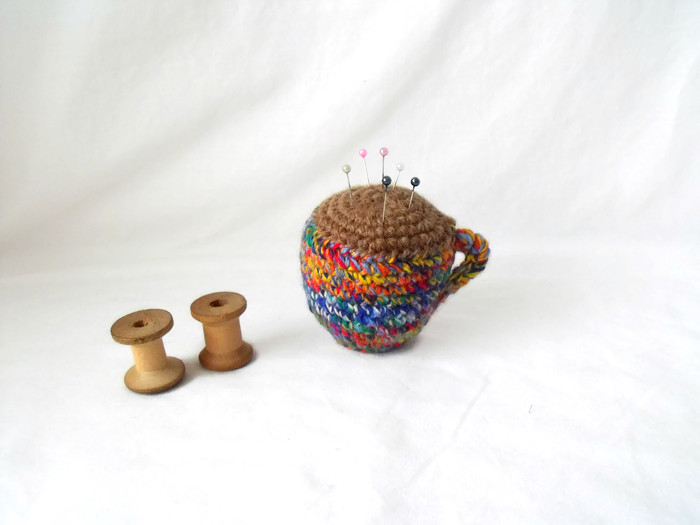 Here we have a crocheted amigurumi tea cup pin cushion for all you sewing enthusiasts to put in your craft room.