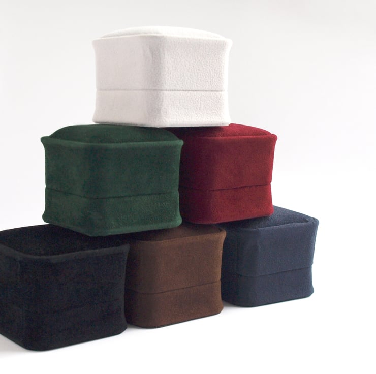 Soft velvet ring box. This beautiful box is wrapped and lined in sumptuous velvet with gently curved corners and piping around the lid.