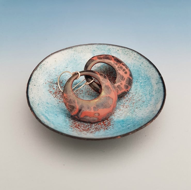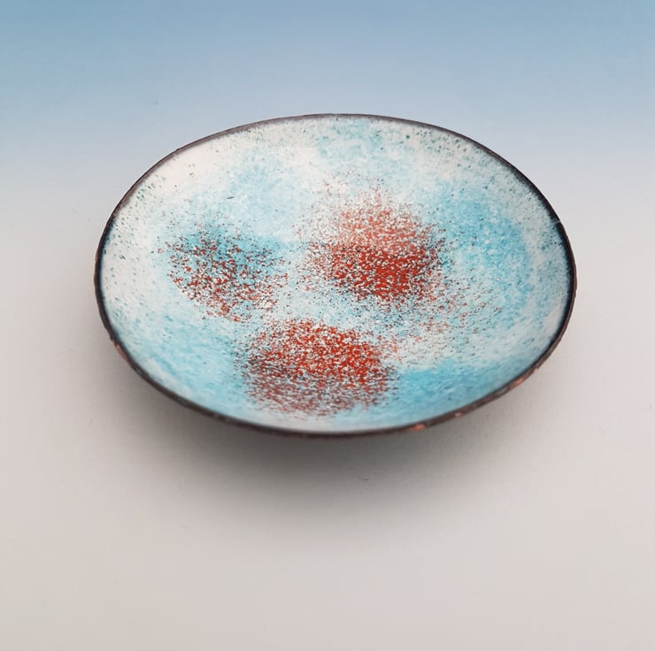 This bowl is made in copper and is enamelled in shades of turquoise and orange which is always a popular combination. It is fired until the enamel becomes molten and a glossy finish