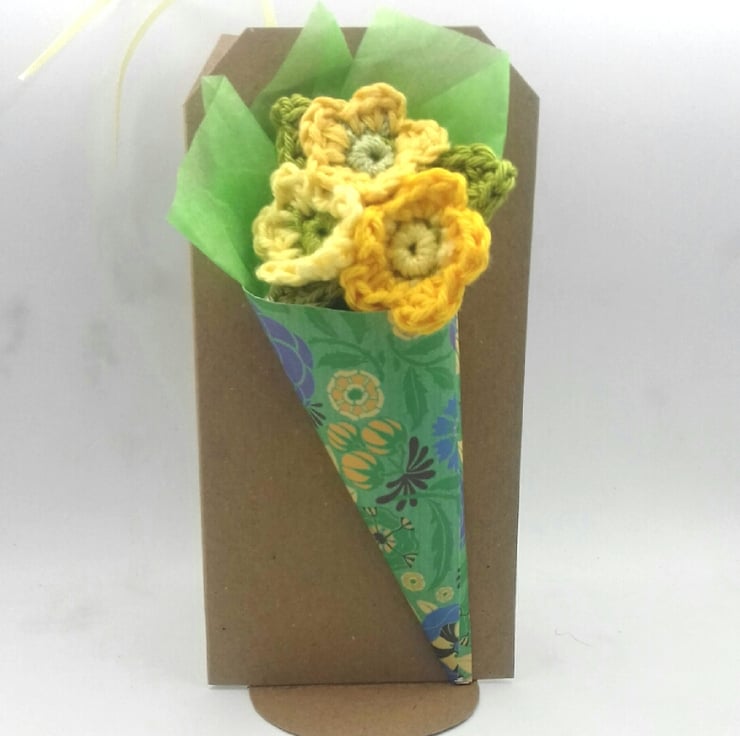The flowers and leaves are crocheted in cotton and stitched to two layers of felt. The brooch measures approximately 6 cm in diameter.