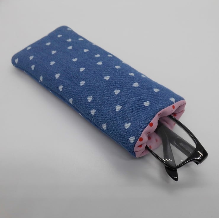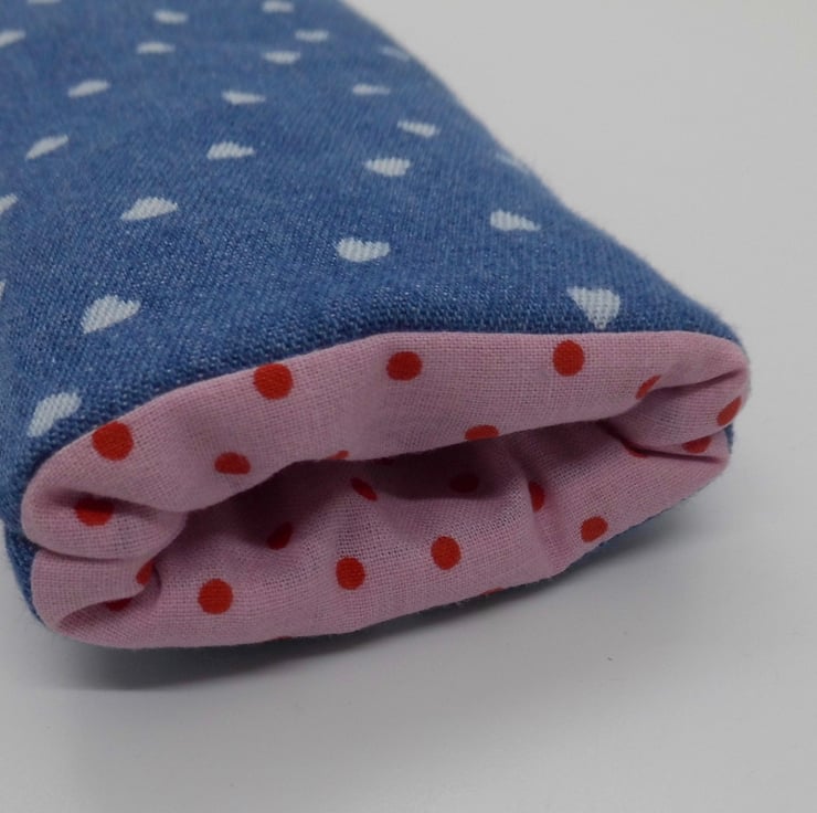 Outer is a blue chambray fabric which is printed with little hearts. Lined with pink and red spotty fabric.