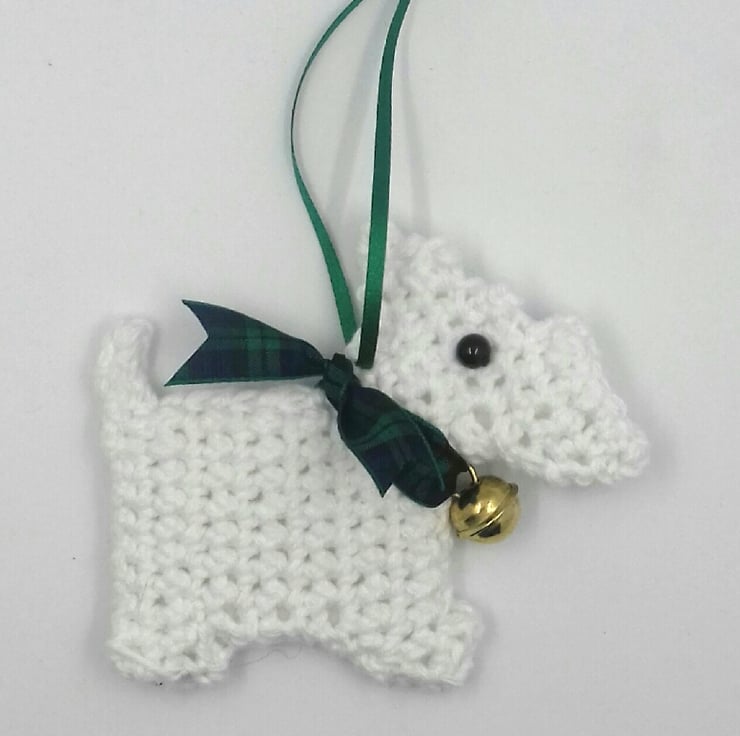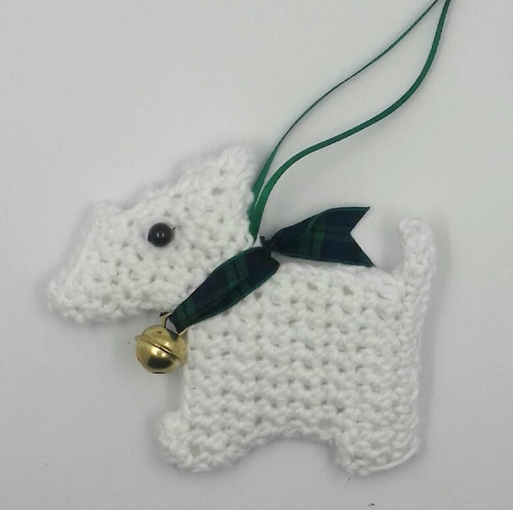 This little dog is crocheted in cotton and lined with felt for added stability. It has glass beads for eyes and a smart tartan ribbon with a jingly bell round its neck.He measures approximately 10 cm from nose to tail and comes wrapped in tissue in a labelled PIP ( Postage in Proportion ) box all ready to be given or posted on.