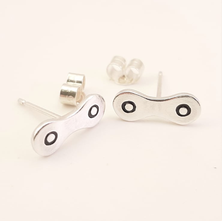 These bicycle chain stud earrings are from my cycling themed jewellery range and have been lovingly handcrafted in Shropshire. They are made from sterling silver sheet and are etched before being cut by hand, the edges are then smoothed using files and emery paper before the earrings are carefully given there shape using a punch and hammer. 11mm ear pins are then soldered onto the back. A black resin based enamel is added to the etched areas and then the earrings are polished.