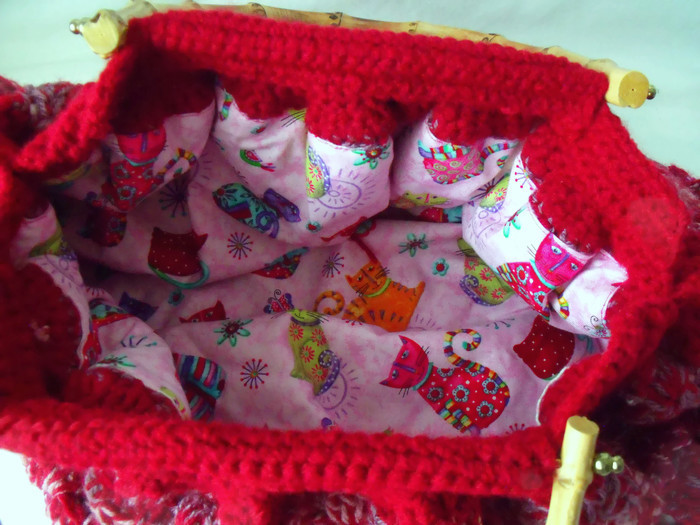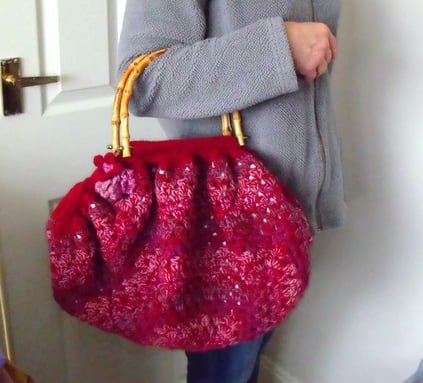 Here is a maroon crocheted granny bag with bamboo handles.