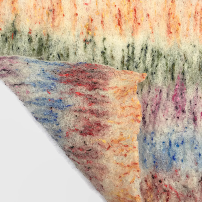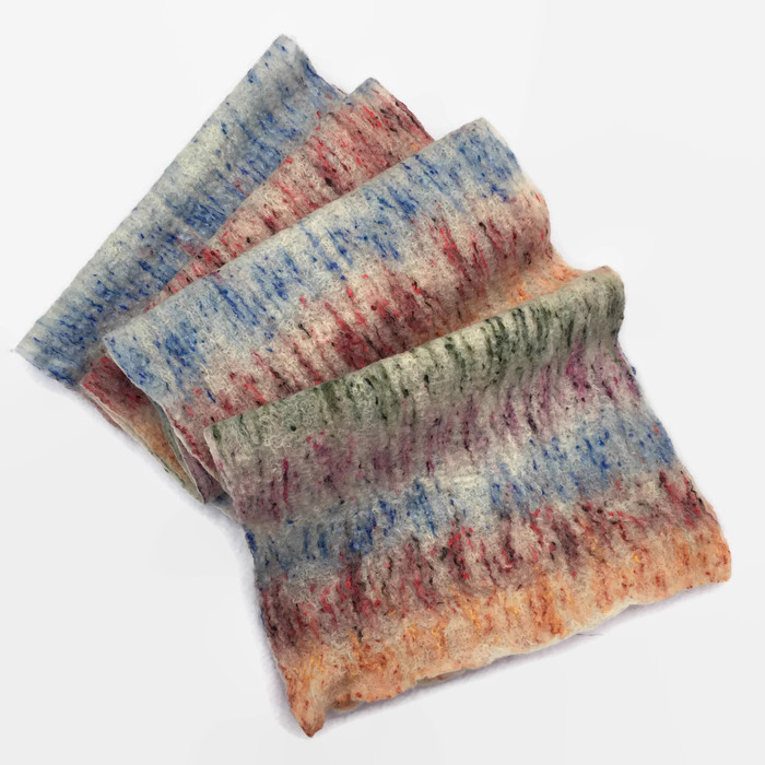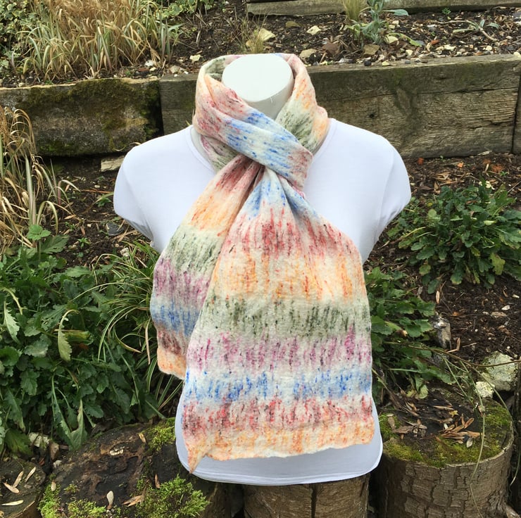This scarf has been made using a blend of wool and silk fibres in various colours laid in several fine layers and wet felted. Included in Seconds Sunday as a clearance/end of line item. The different colours have been added in horizontal stripes. A speckled "tweed" effect is the result of the wool/silk fibre blend taking up dye at different rates during the dying process. The resulting scarf is soft and lightweight.