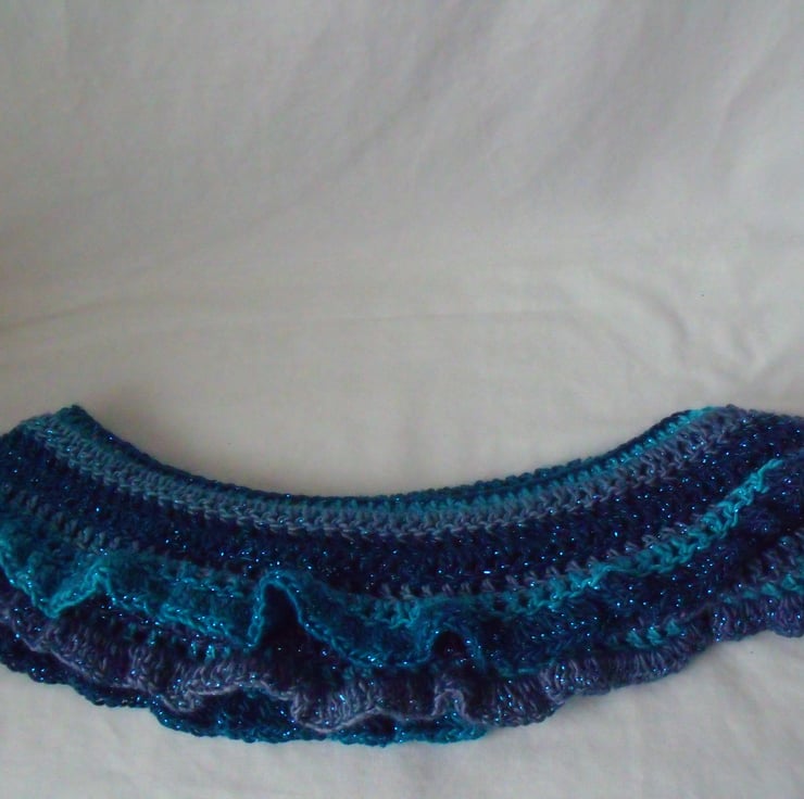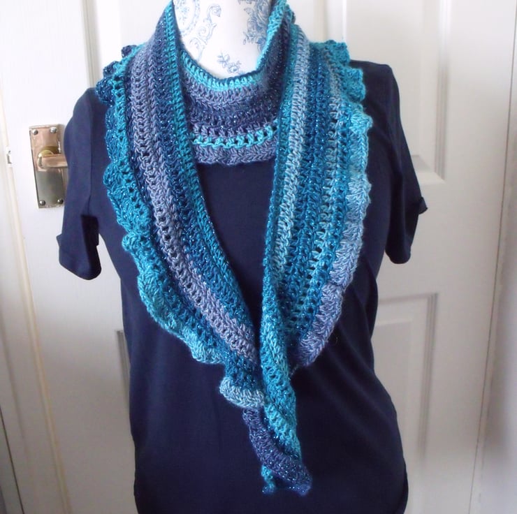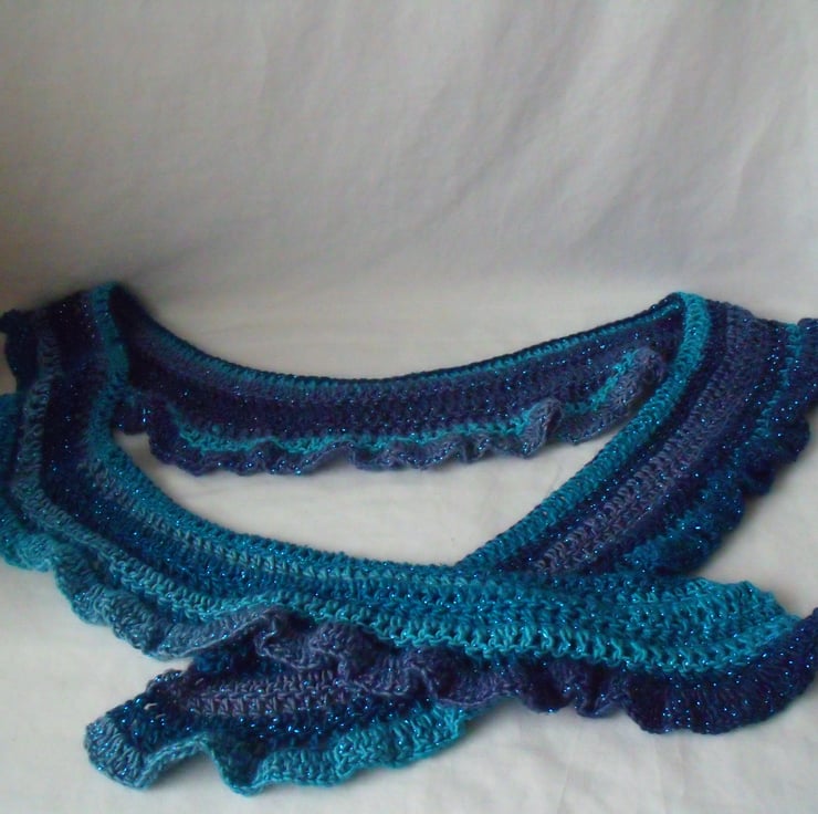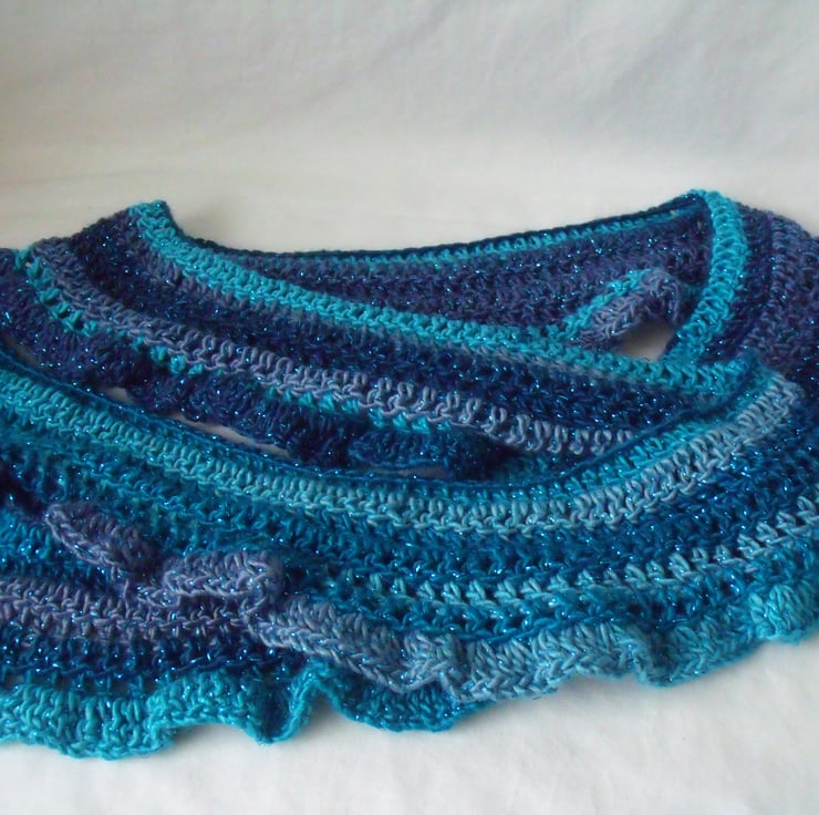 Here we have a beautiful variegated blue and turquoise crocheted sparkly scarf.