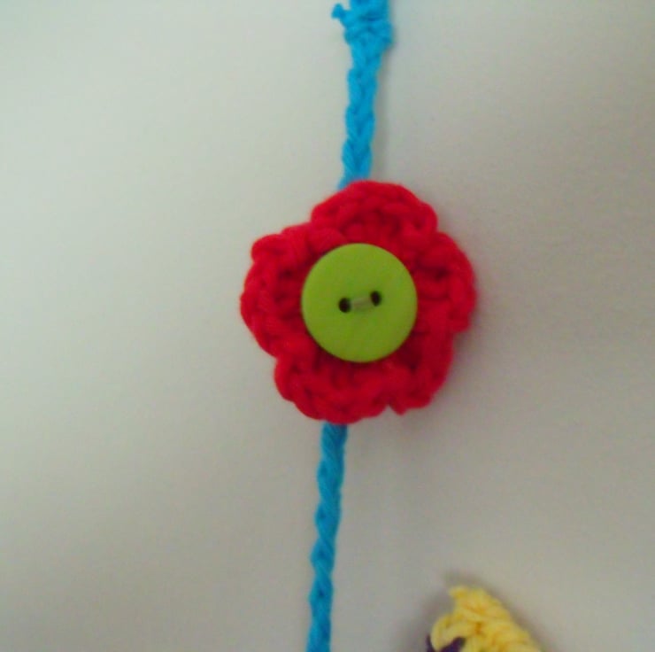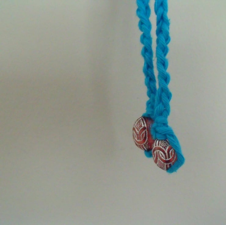 It hangs from turquoise thread which I've attached a flower and he has beads for feet.
