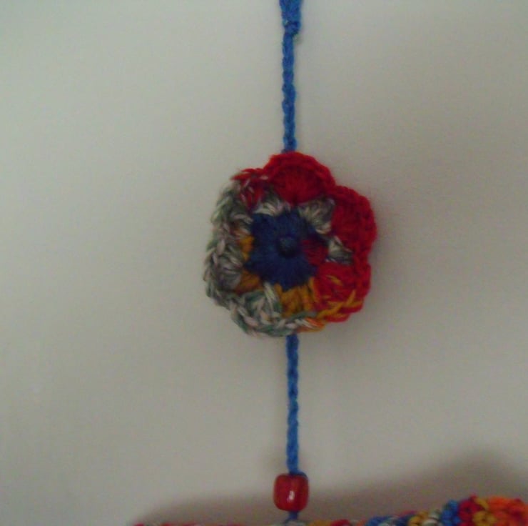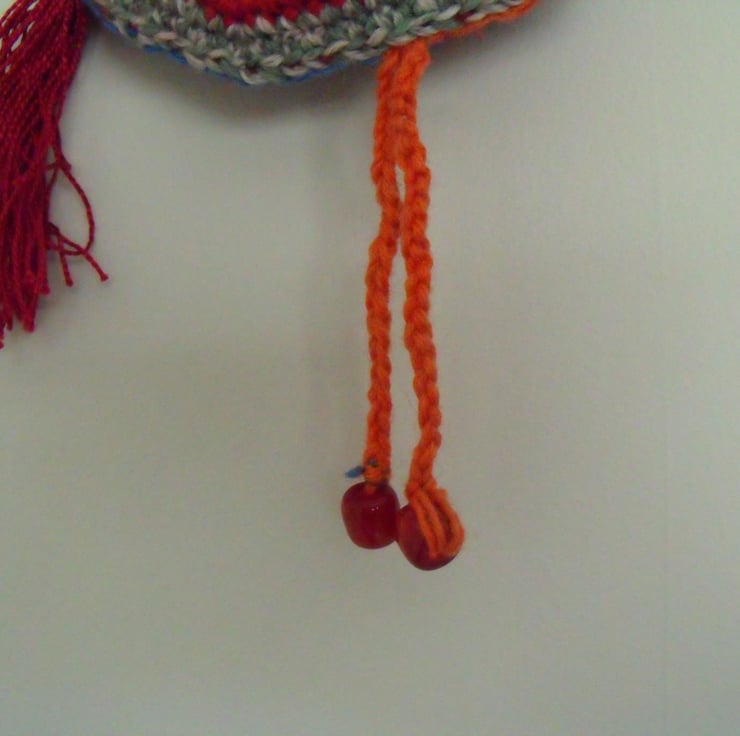 It hangs from turquoise thread which I've attached a flower and he has beads for feet.