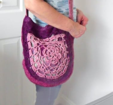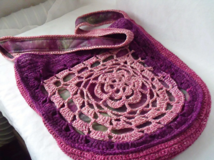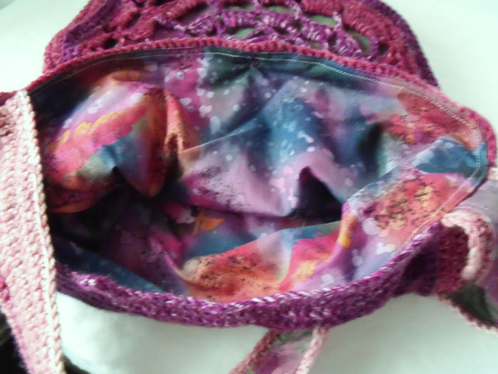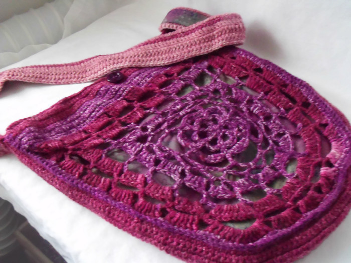 Here we have a unique granny square crocheted plum coloured shoulder bag which is fully lined with tie dyed cotton fabric.