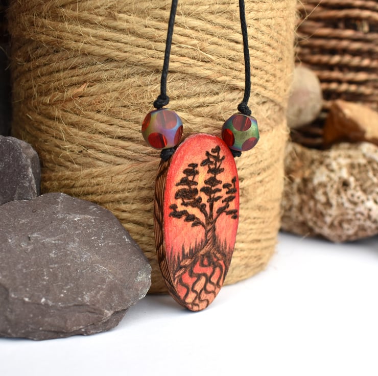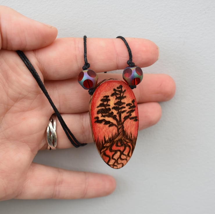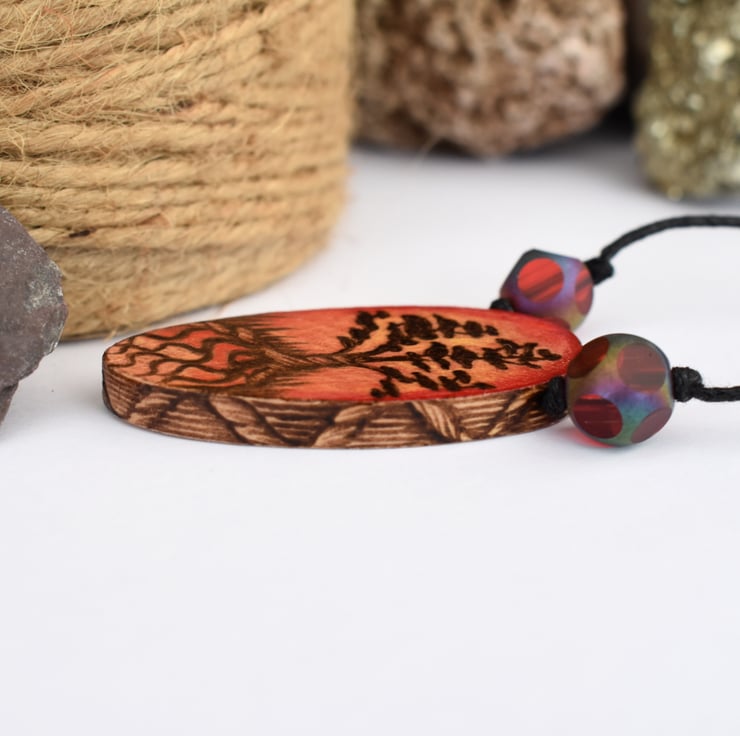 A lovely hand burned pyrography bonsai tree pendant with a vibrant prismacolor sunset in warm cinnamon colours. Surrounded by two gorgeous red beads. Ideal nature lover gift, or a fab idea for a wood anniversary gift.