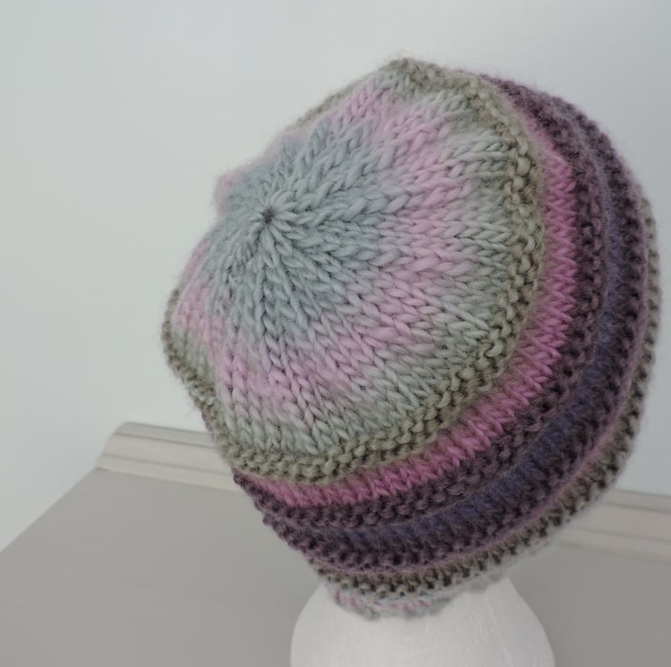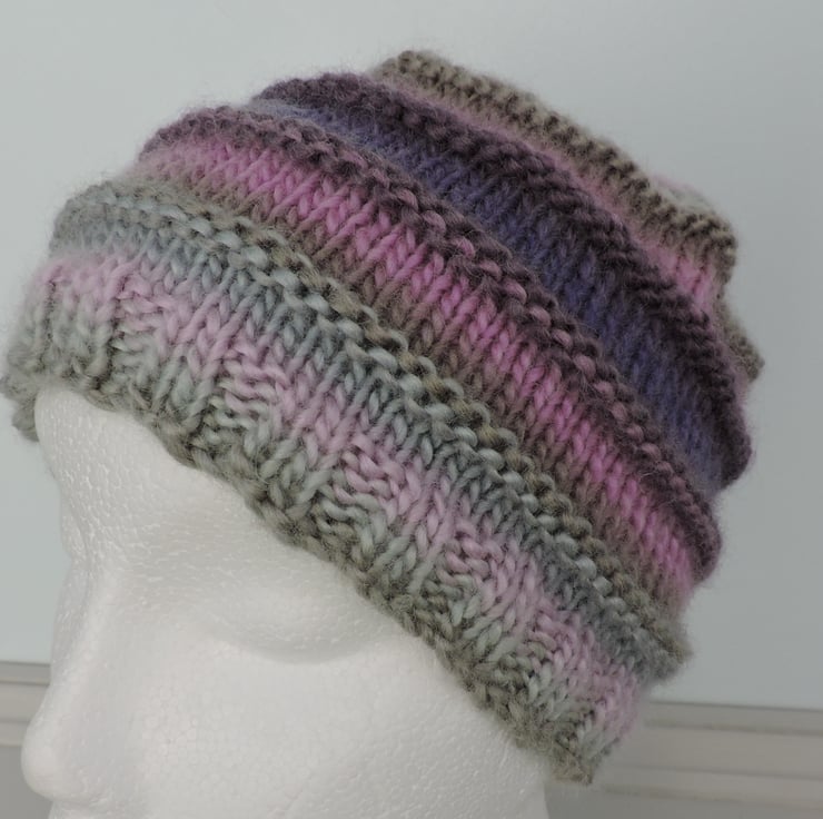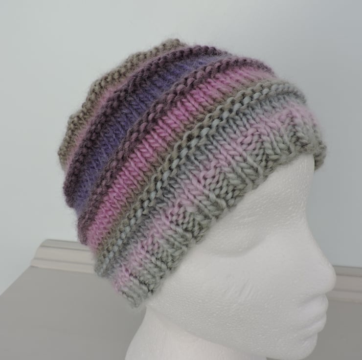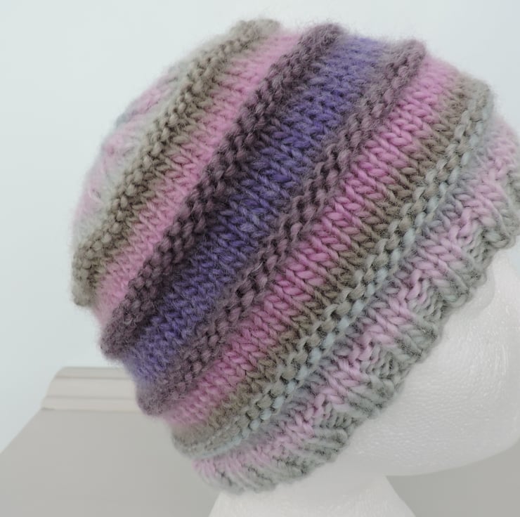 This striped adults knitted beanie hat has been made using a chunky wool and acrylic self striping graduated yarn. Lovely soft colours of pink, lavender, grey and taupe. A soft and warm hat perfect for keeping you snug and warm in the cold weather.