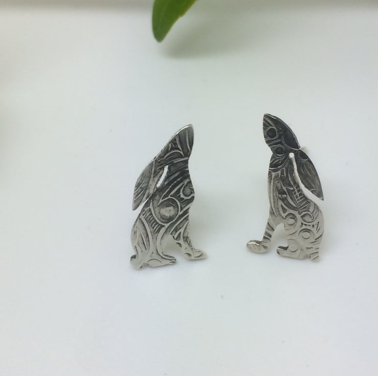 Hand sawn hare stud earrings created from texture sterling silver. 15mm x 7mm