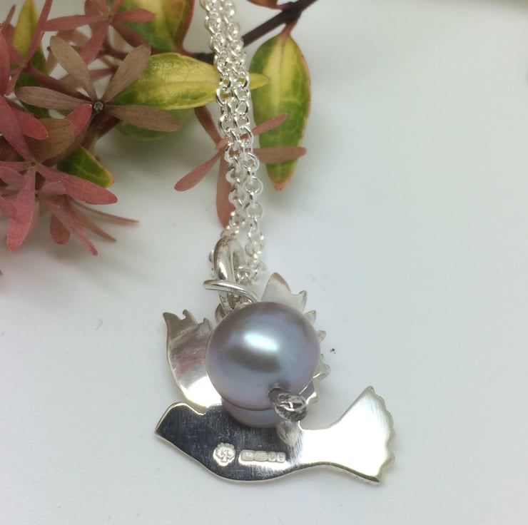 Dove pendant with grey freshwater pearl. On 18" chain as standard. 20 x 25 mm. This item is hand sawn by mean. Meaning that even if I repeat the design each one is unique.