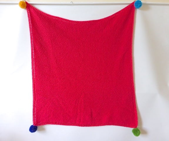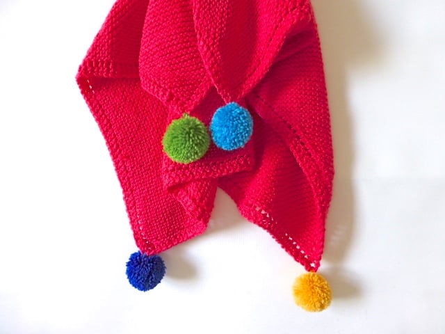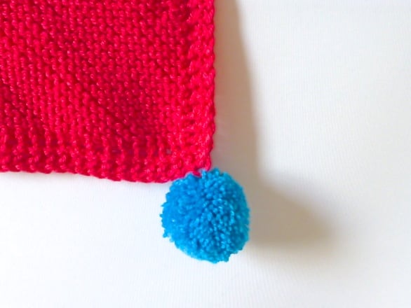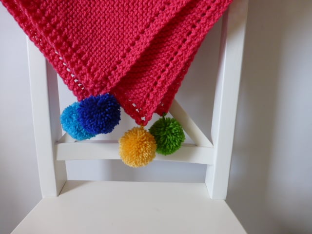 It has been knitted on the diagonal with good quality, chunky pink yarn and finished with brightly coloured pompoms.