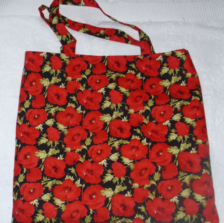 Bright red poppies all over design on black background cloth shopping bag, very comfortable to carry with fabric handles , ideal for carrying shopping . bag measures approx37.5 cm x 39 cm .can be folded up to fit inside a handbag, washable cotton fabric.