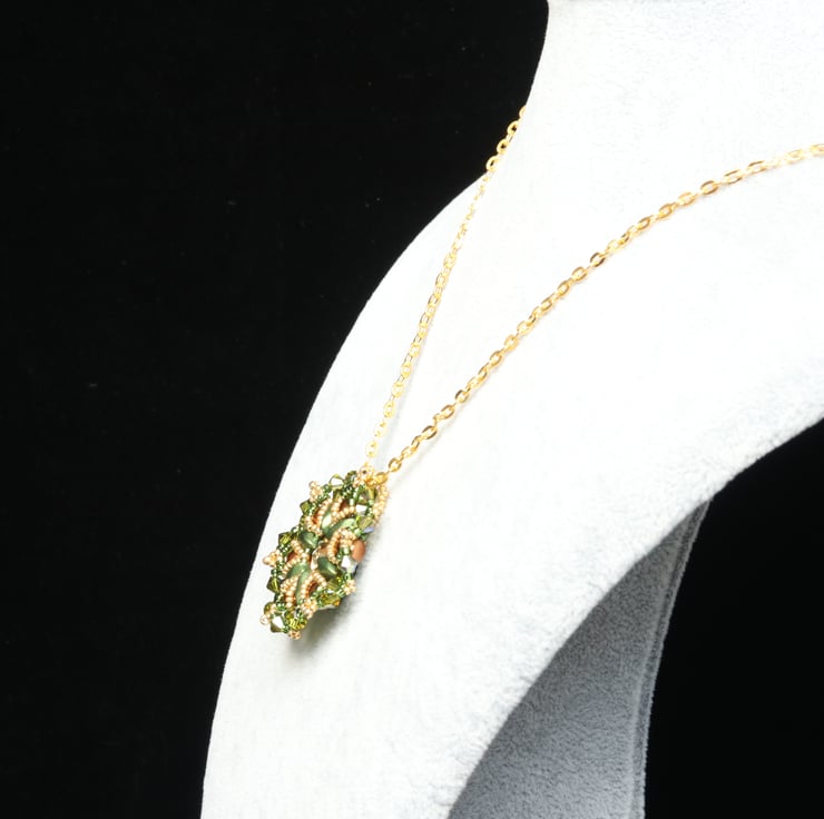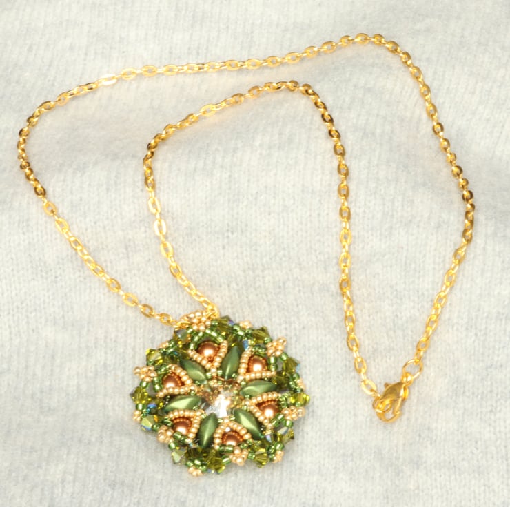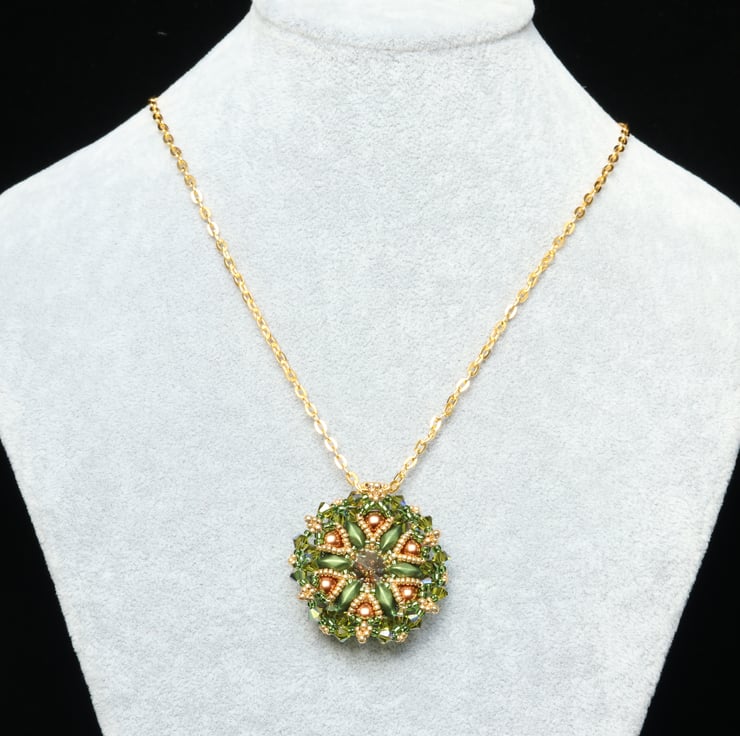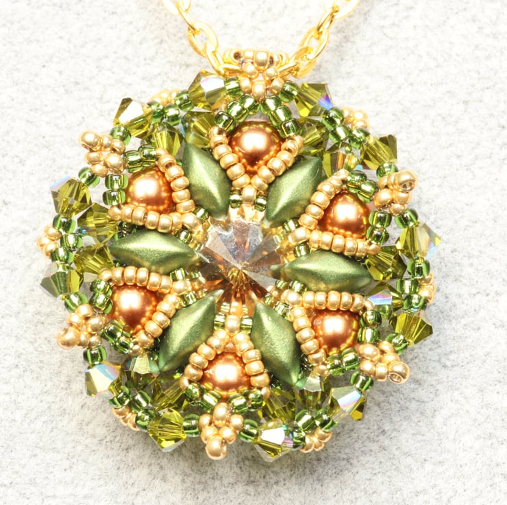 This handmade sparkly pendant has at its centre a pretty champagne coloured Swarovski rivoli crystal, which has been surrounded by diamond shaped gem duo beads and Swarovski crystals in olive green, also gold coloured pearly beads and seed beads. The pendant is round but the edge undulates, putting the crystals at an angle and thus helping them catch the light.