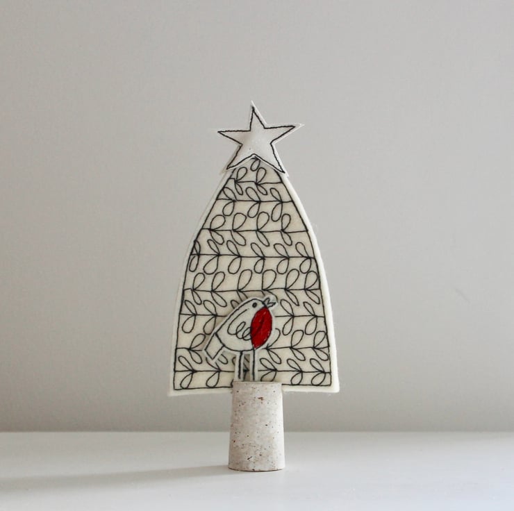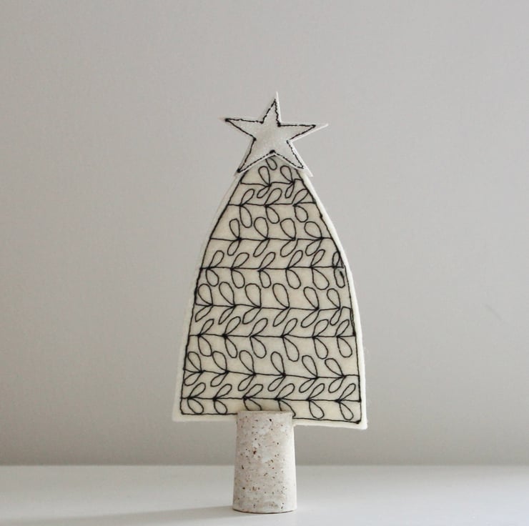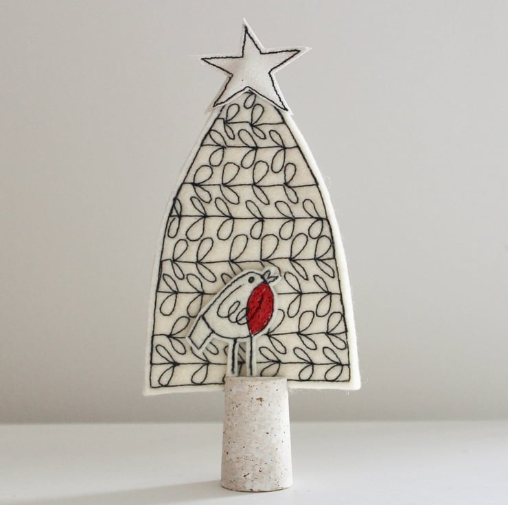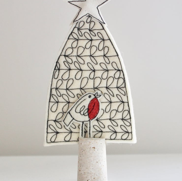 Little trees are created using free hand machine embroidery, 100% wool felt, glitter cloth and hand painted cork trunks.
