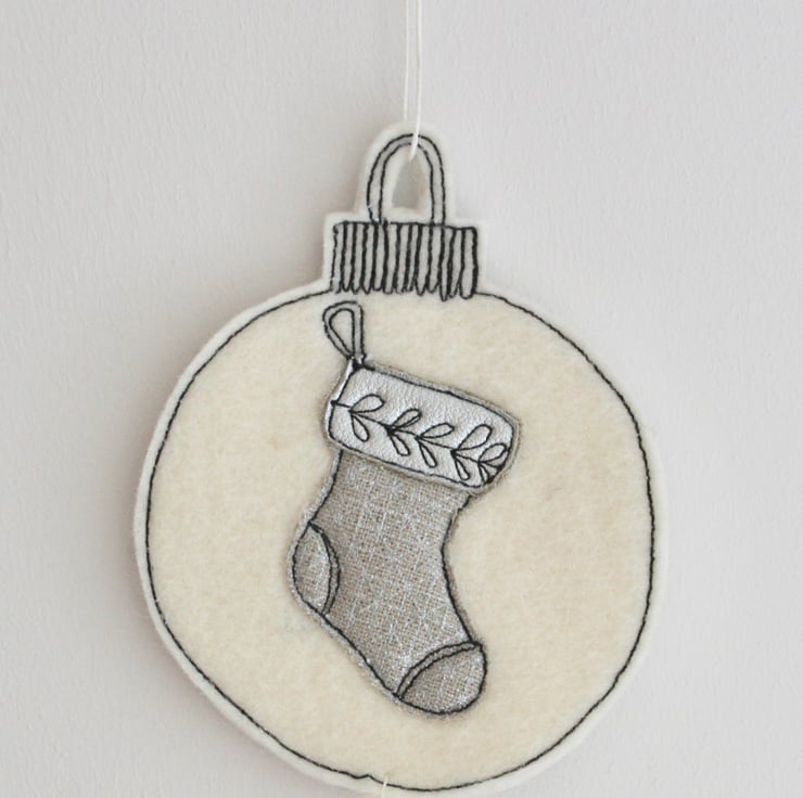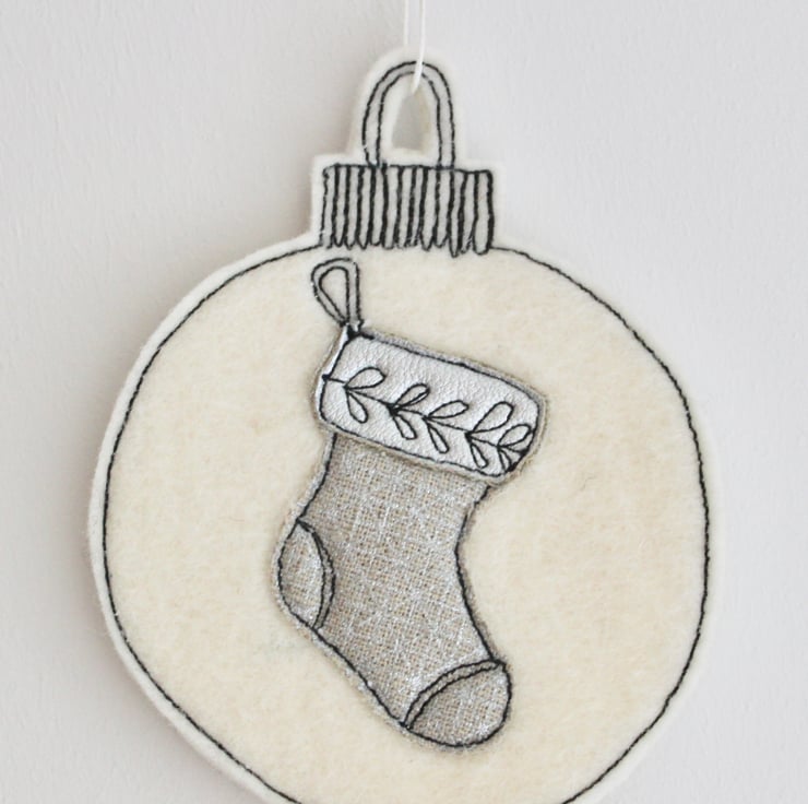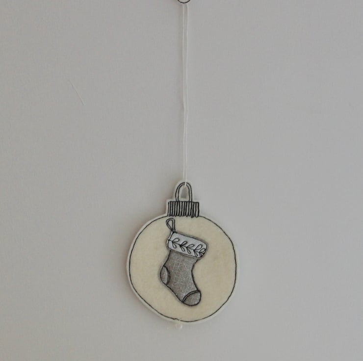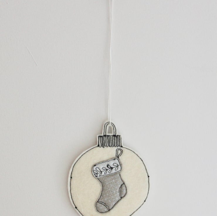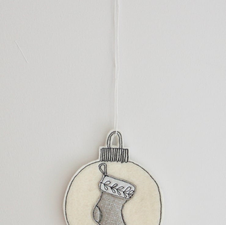Wool felt bauble is created using 100% cream wool felt, cotton cloth, glitter cloth, a glass bead and free hand machine embroidery.
