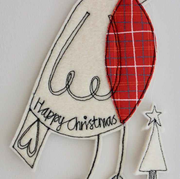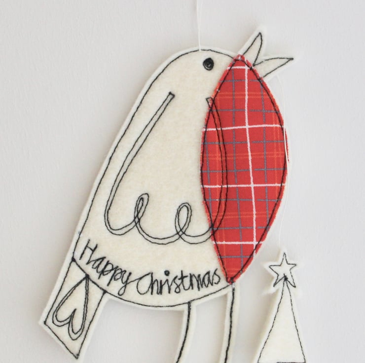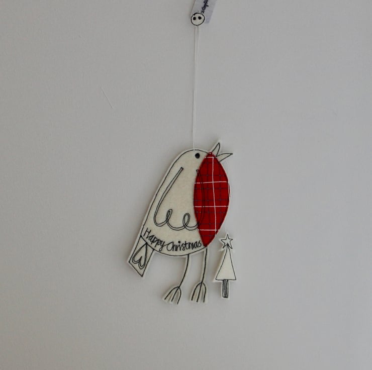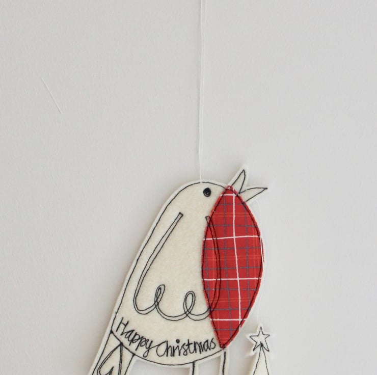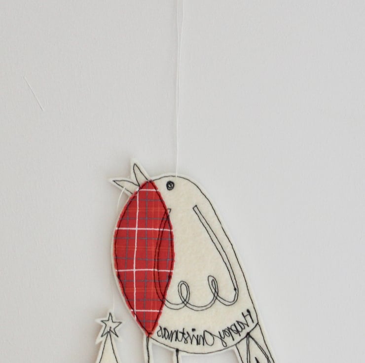 Mr Robin is created using 100% cream wool felt, printed cotton cloth and free hand machine embroidery. Suspend him from your Christmas tree and he will make you smile.