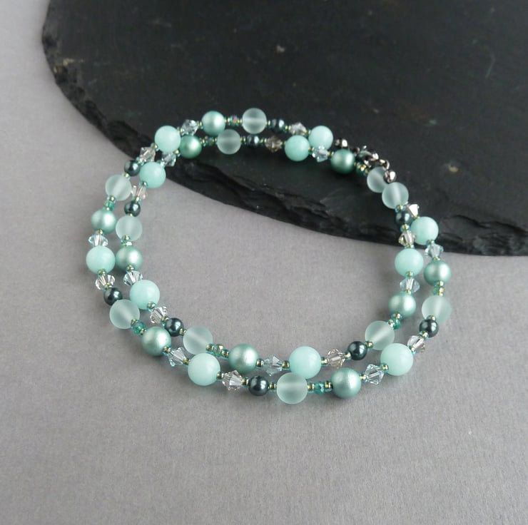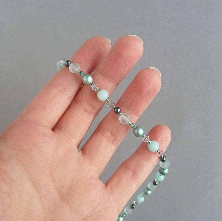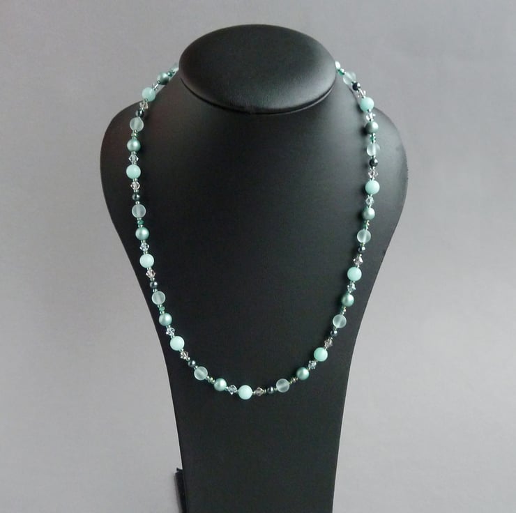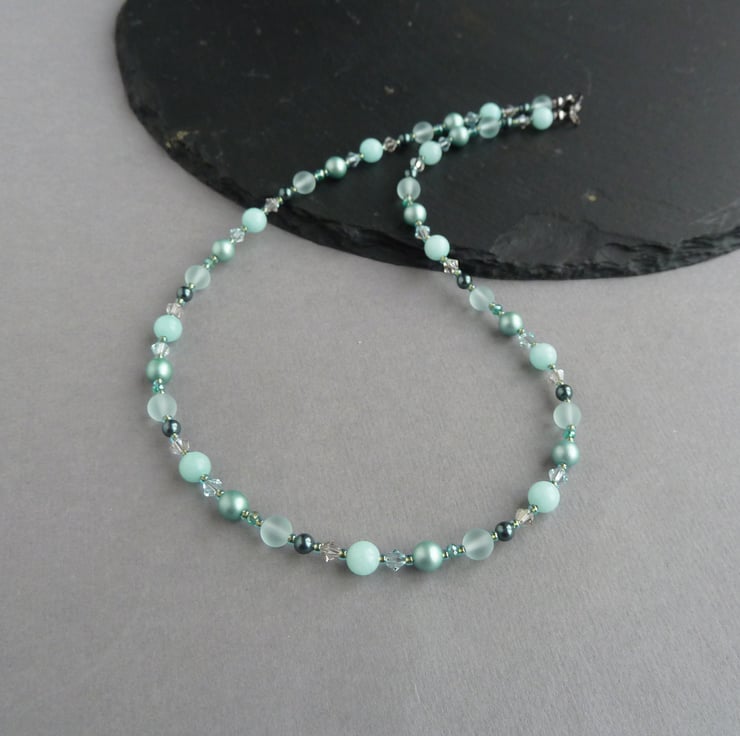 This jade green beaded necklace has been created using Swarovski pearls, Swarovski crystals, sea glass and jade beads. The crystals really sparkle in the light and the pearls have an opulent lustre. These single strand necklaces are simple enough to be worn everyday but can also be dressed up for more formal occasions.