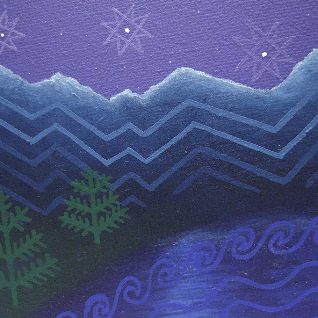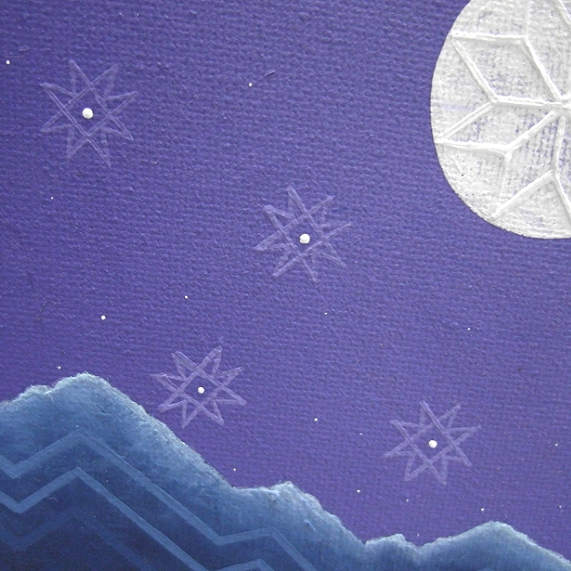 A night scene of a mountain landscape, with a bright full moon shining over a lake in a clear, starry sky, and pine trees stood on the shore with a mountain range in the distance. Simple geometric patterns have been painted over the scene, the symbols representing the features that they are painted over.