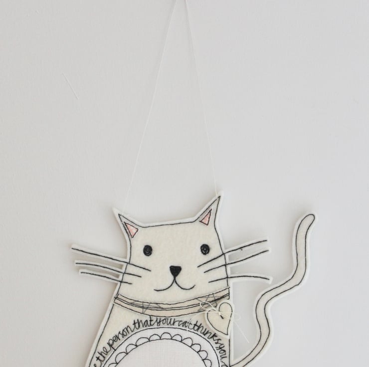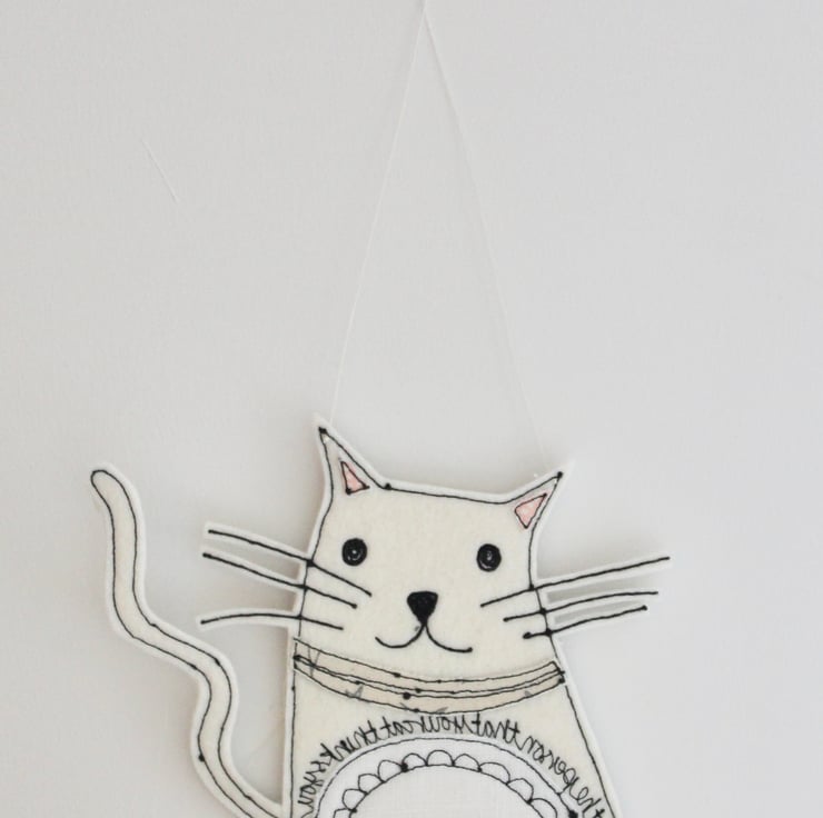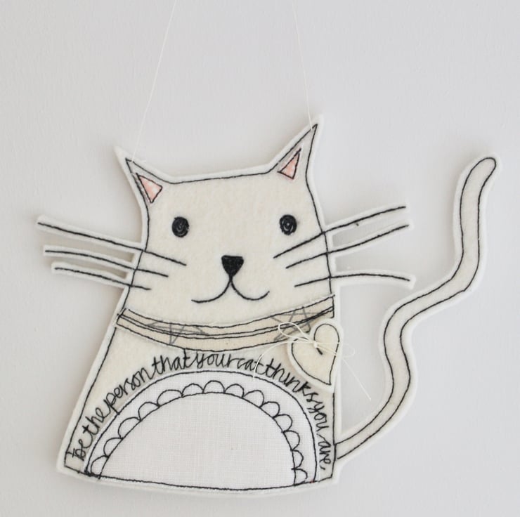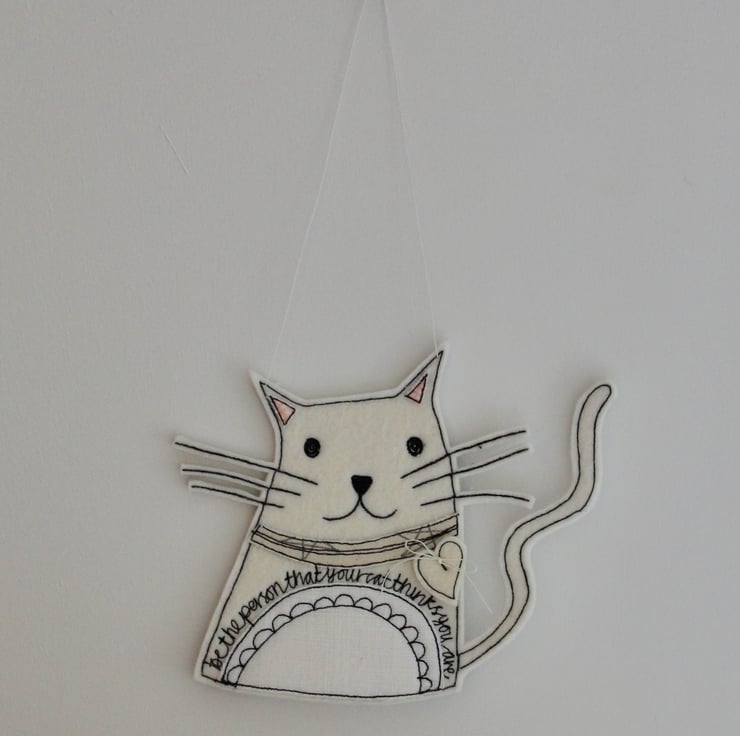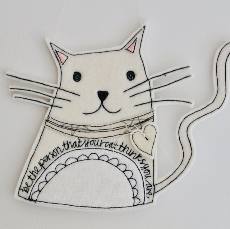 A delightful hanging decoration which is created using 100% cream wool felt, cotton cloth, linen cloth and free hand machine embroidery. She has a white linen chest, a printed collar, a heart and the sewn words 'be the person that your cat thinks you are'.