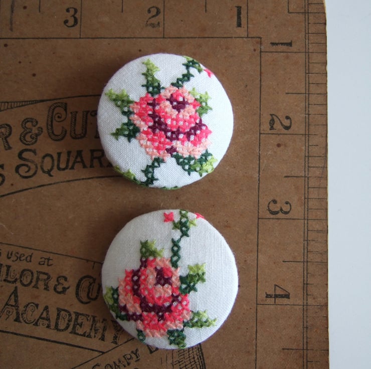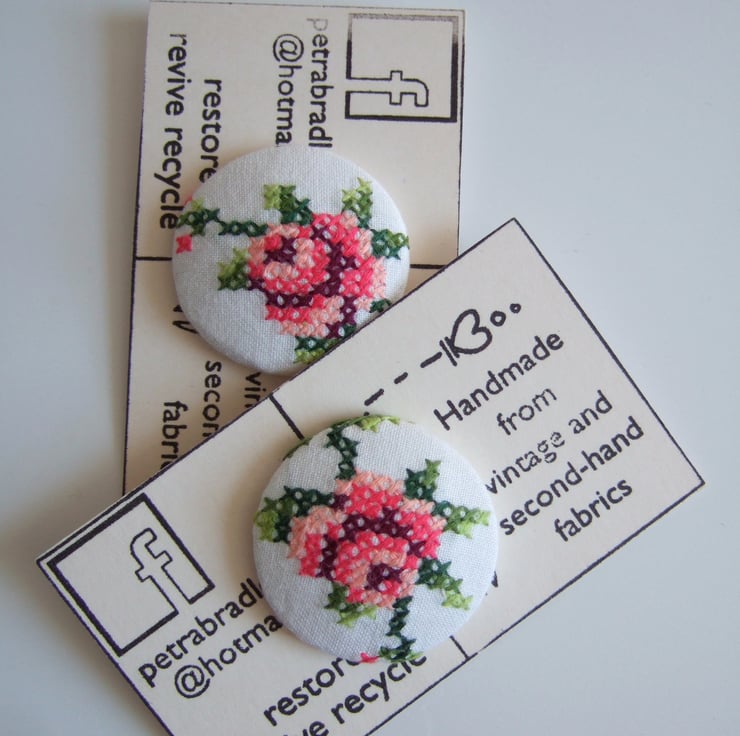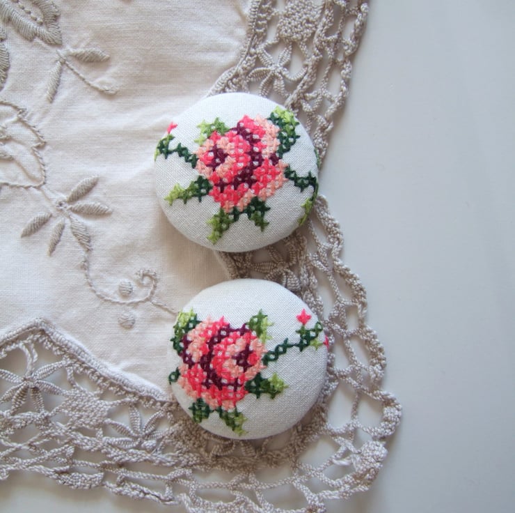 The roses on these extra- large metal buttons are each from a pretty piece of vintage embroidery, taken from old table linen.Tiny fragments of homemade table napkins, which have been rescued, and given a new life and purpose.