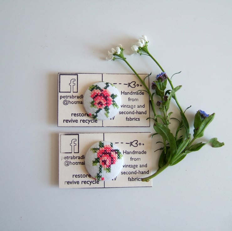 Each features a pink rose from an old hand embroidered range of table napkins, sewn in cross stitch.