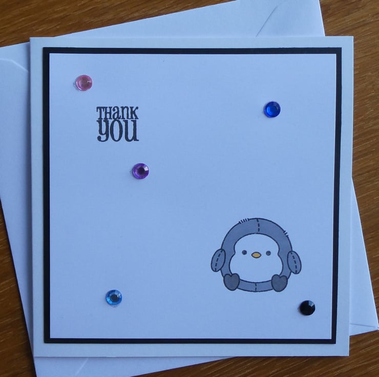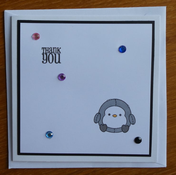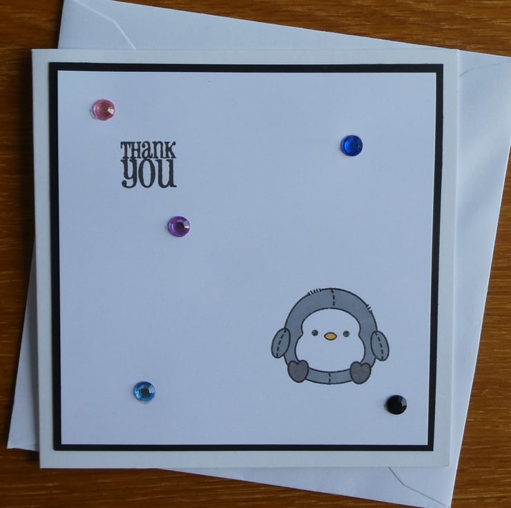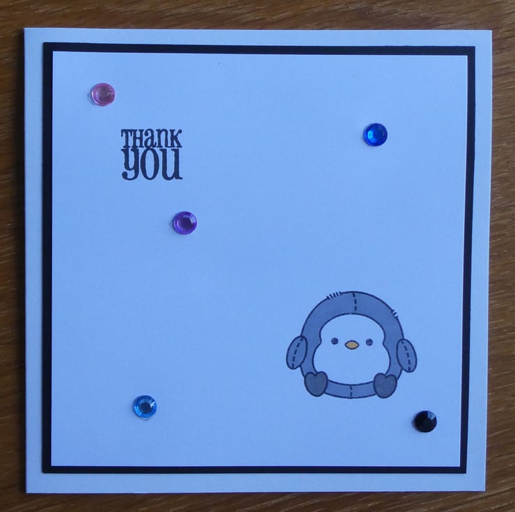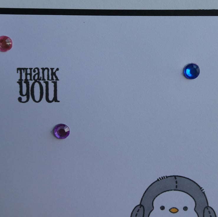 This cute little thank you card has a hand stamped and coloured penguin surrounded by coloured gems in shades of pink, blue, purple and black and would be ideal to have on standby to send your thanks for gifts or kind deeds.