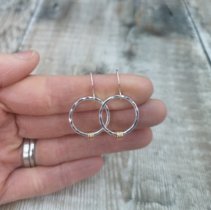 These pretty handmade circle earrings are crafted from recycled Sterling Silver, accented with your choice of 3 to 7 gold loops to represent milestones, loved ones, or special moments. The hammered silver rings catch the light beautifully, while the delicate gold loops add a hint of contrast and charm. Made to order, each pair is unique and tailored just for you. Perfect as a meaningful gift or a personal keepsake, these earrings are ideal for celebrating life’s special occasions in style.