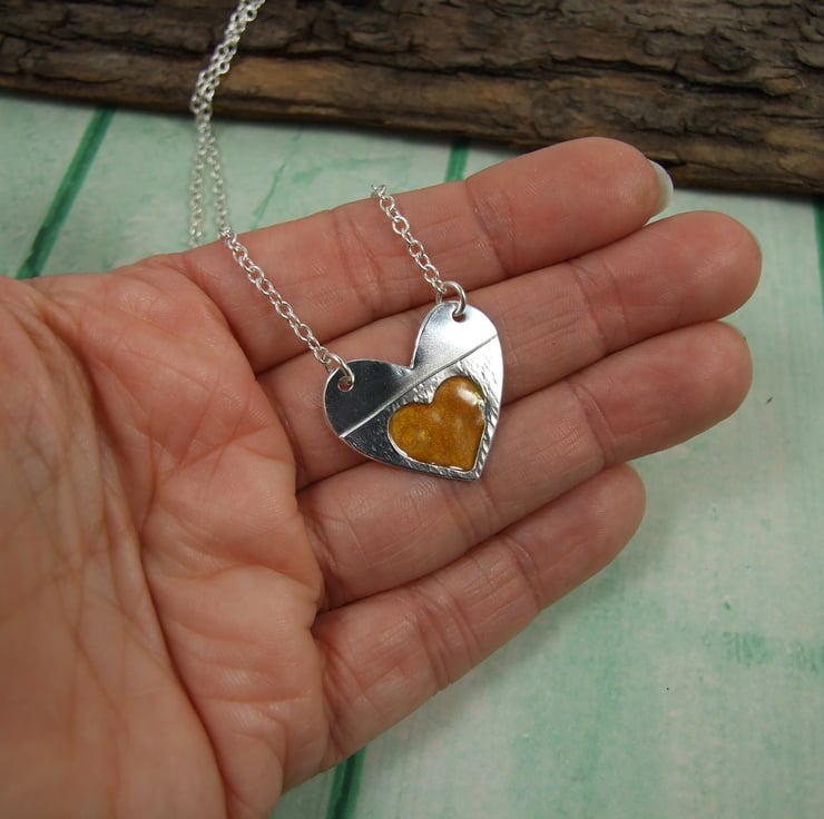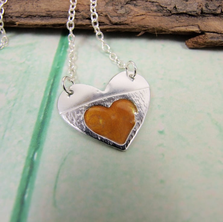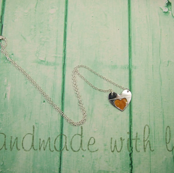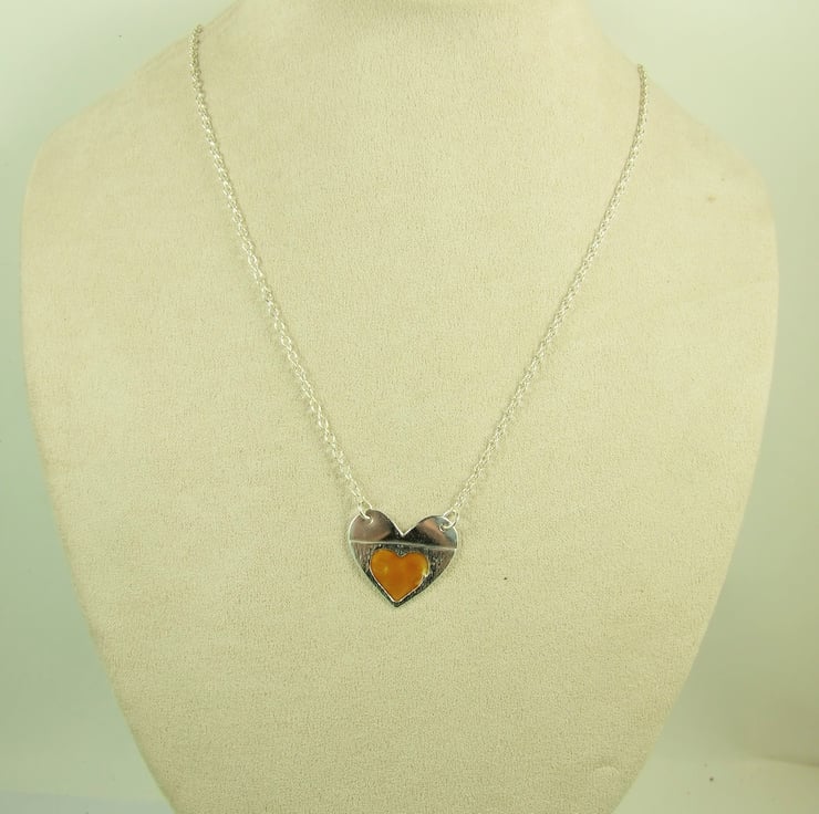 Silver Heart Pendant, hand painted with orange enamel, Necklace.