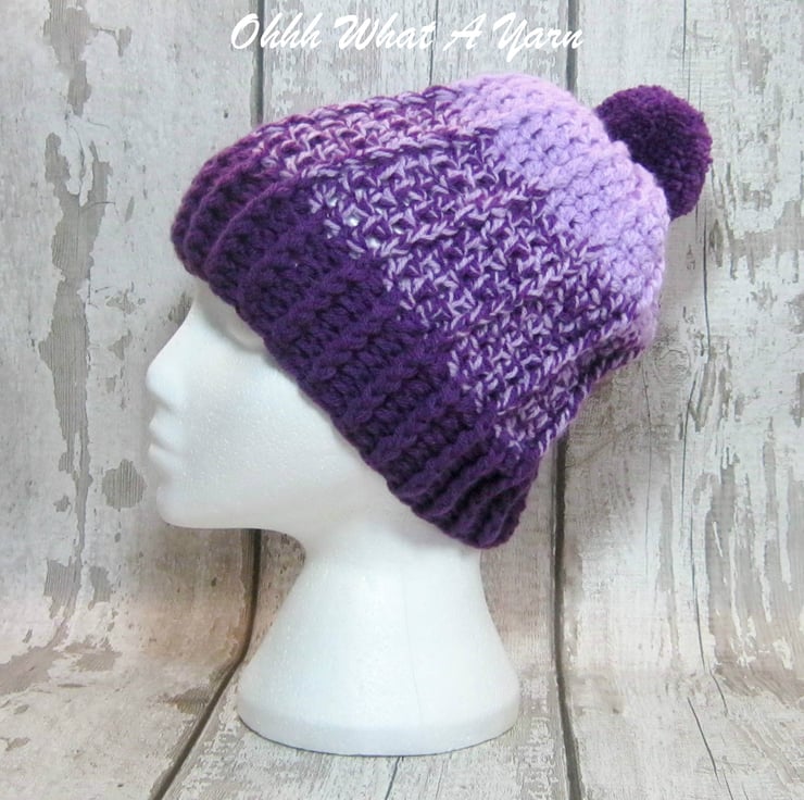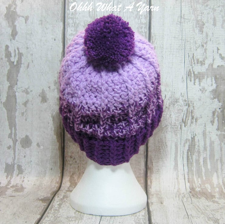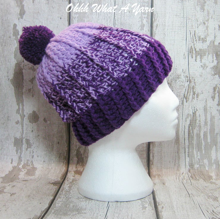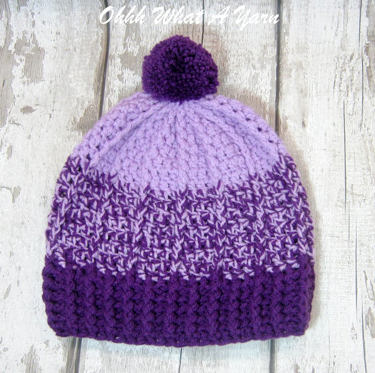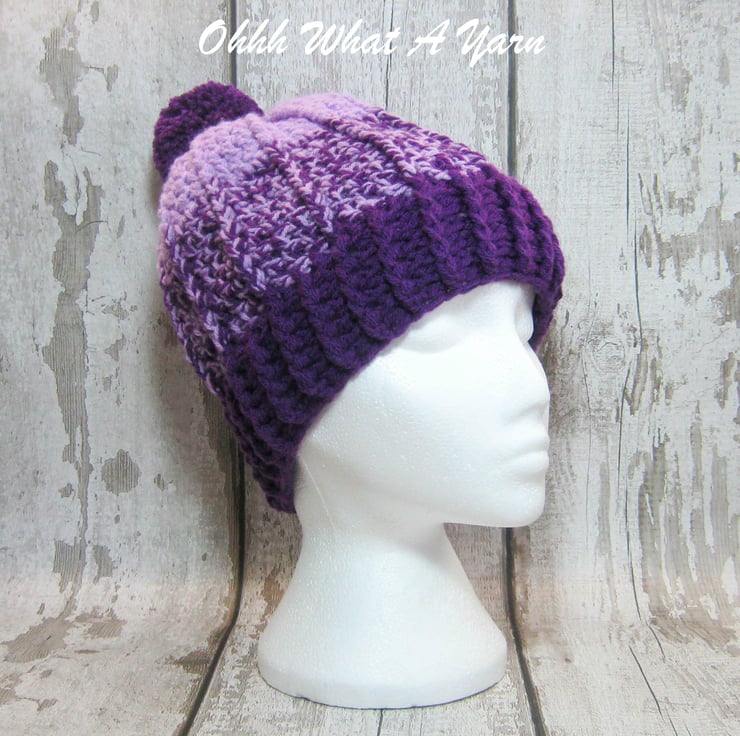 This cosy chunky hat has been crocheted using 100% acrylic yarns. It is crocheted with two contrasting yarns in order to make the ombre/gradient effect. It has a simple raised rib pattern to the body of the hat and a lovely ribbed band, and it is finished off with a gorgeous handmade pom pom.