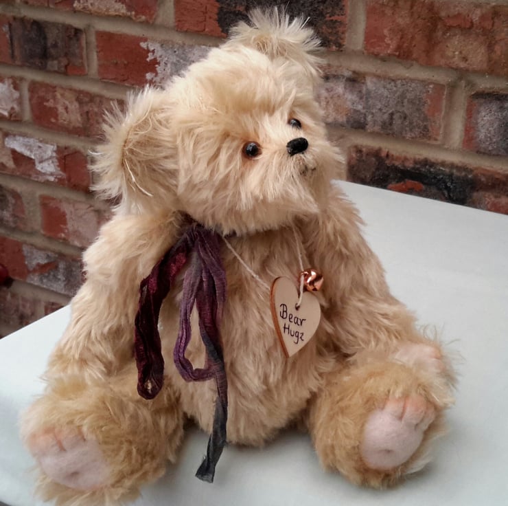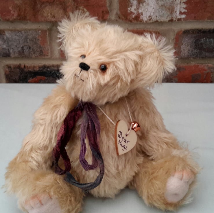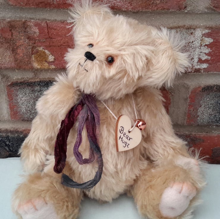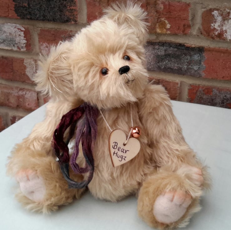 Bear Hugz is 11.5" tall and hand made from a luxury 20mm whirl mohair in harvest whirl.