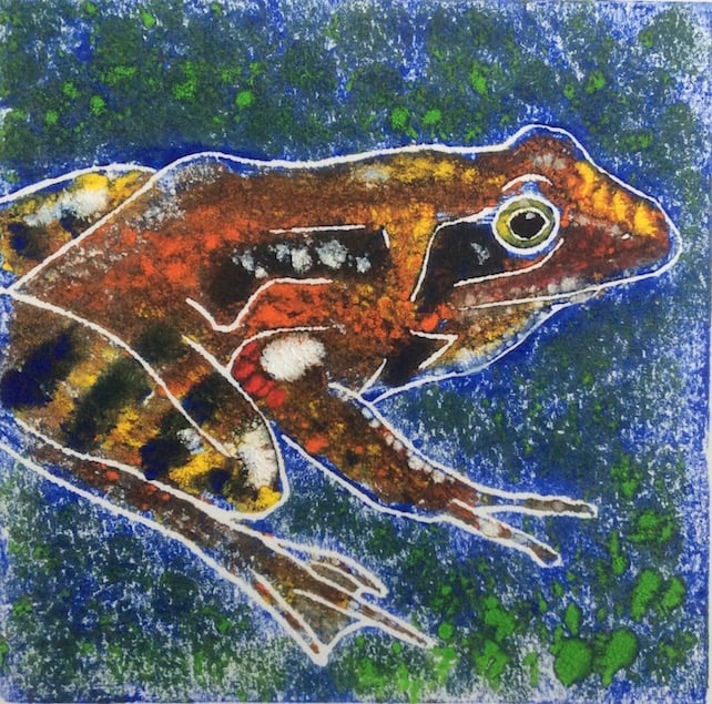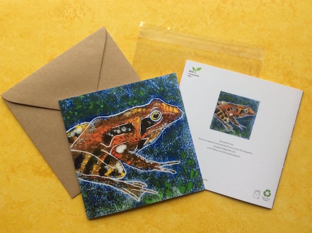 Speckled Frog depicts a common but very endearing frog. This greeting card is a printed copy of a hand painted linocut. The background is blue and green and the frog is multi-coloured in warm oranges and darker brown markings. The inside of the card is left blank for your own message.