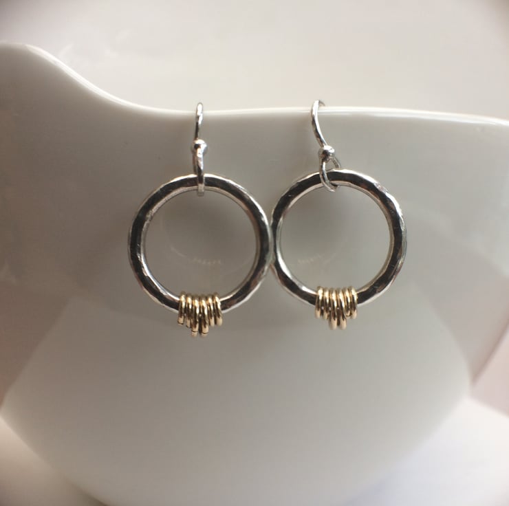 Lovely hand forged thick sterling silver hoops have been given a hammered texture to ensure they catch the light beautifully. Six graduated 9ct gold fine rings embellish the hoops for added interest and colour.