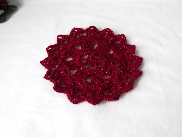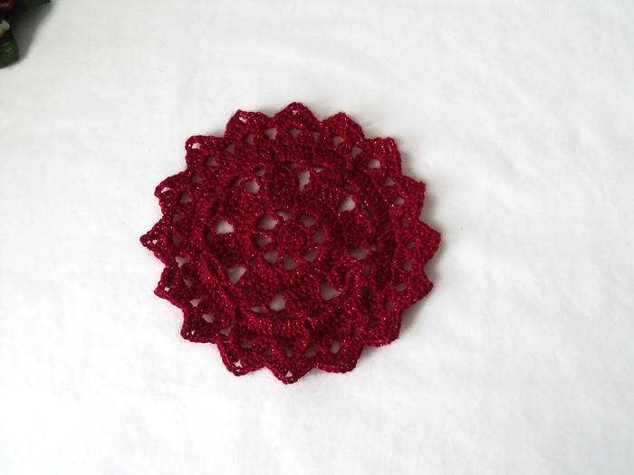 red sparkly crocheted christmas doily, crochet candle mat table decoration