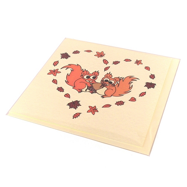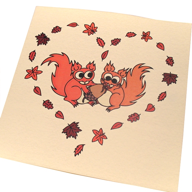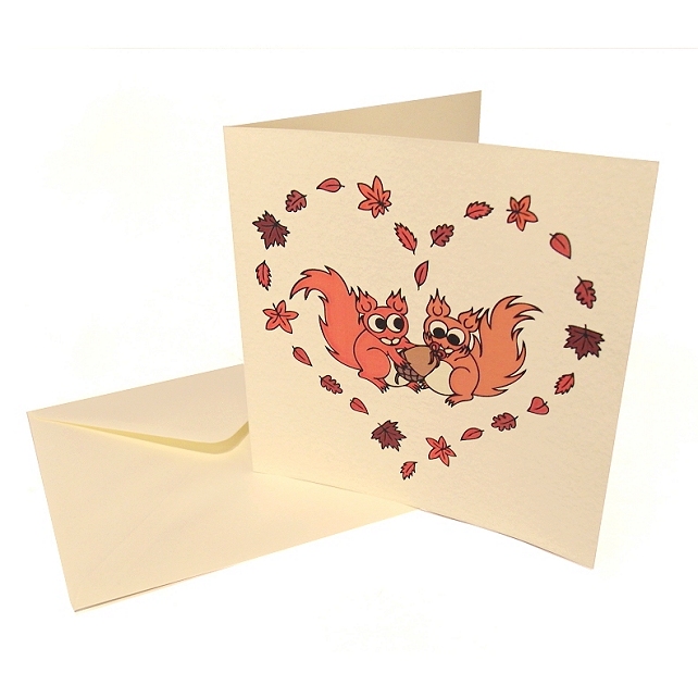 This original squirrel design by Kim Onyskiw is printed on a 15cm x 15cm (6" x 6") square ivory card, and comes with an ivory envelope. The inside of the card is blank for your own message.