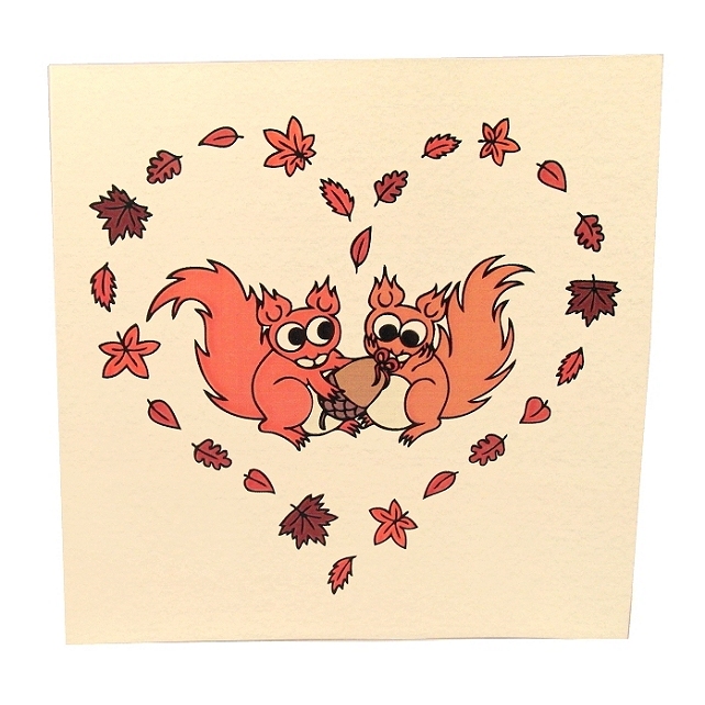 A pair of cute red squirrels are stood in a heart shape made from autumn leaves, with one squirrel giving the gift of a giant acorn with a bow on top to its love.